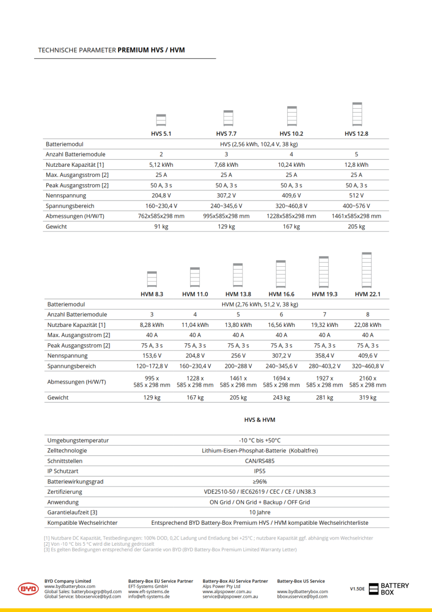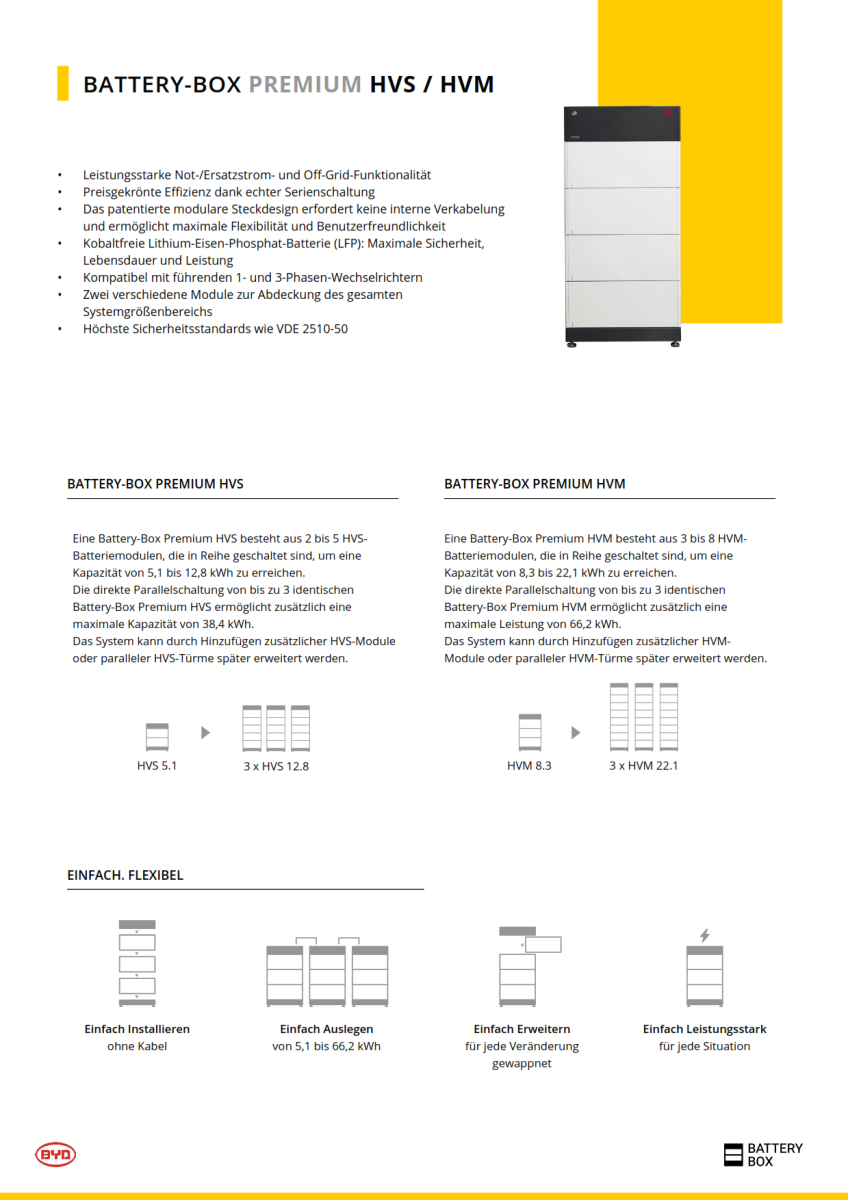Mit der BYD Battery-Box Premium HVS BCU können Sie einen Turm mit mindestens zwei bis maximal fünf HVS Batteriemodulen zusammenstellen. Diese werden in Reihe geschaltet, um eine Kapazität von 5,1 bis 12,8 kWh zu erreichen. Die direkte Parallelschaltung von bis zu drei identischen Battery-Box Premium HVS ermöglicht zusätzlich eine maximale Kapazität von 38,4 kWh. Das System kann durch Hinzufügen von HVS-Modulen oder paralleler HVS-Türme später noch erweitert werden.